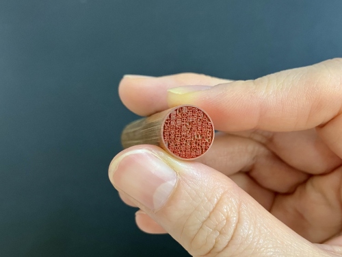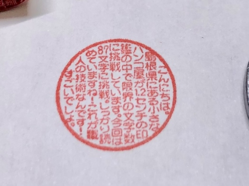 こんにちは。島根県にある小さなハンコ屋が1.2センチの印鑑の中で限界の文字数に挑戦しています。今回は87文字に挑戦。しっかり読めていますね!これが職人の技術なんです!すごいでしょ。