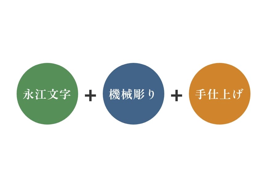 こだわりの永江文字 + 彫刻方法のこだわり + 一本一本、心を込めた手仕上げ
