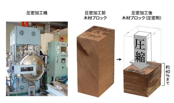 圧密加工は水と熱と圧力だけで木材を圧縮し、薬品を一切使わずに形状を固定するという特殊技術です。この技術を用いて出来た「圧密材」を原材料とすることで、高強度・高比重で、針葉樹独特の綺麗な年輪目を持つ、上品で味わい深い商品が生まれるのです。