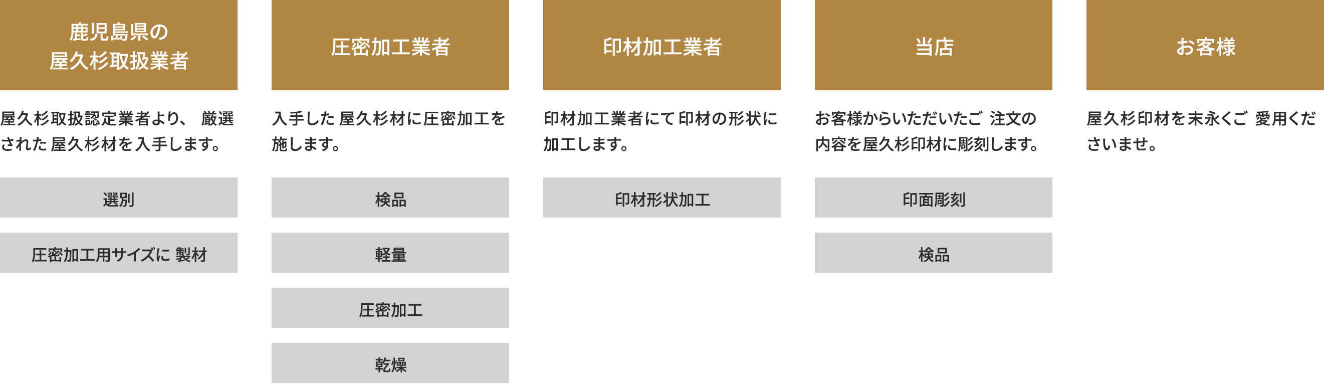 古代の歴史と生命力に対する畏敬の念から、最終仕上げの磨きにもこだわりました。専用ワックスで一本一本を丁寧に磨き上げることにより、屋久杉独特の和やかな美しい木目と茶褐色の高級感溢れる光沢が出現しました。正に古代の生命に直接触れているかのような感さえあります。前述の圧密加工によって、強度・靱性・均質性のみならず、木材繊維をそのままの形で残していることから、印章として最も大切な「綺麗な印影」も得ることが出来るのです。